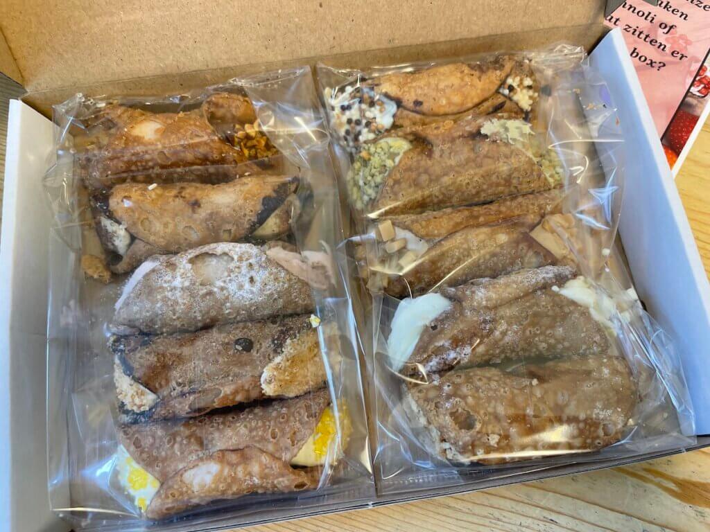 De cannolibox met 10 verschillende smaken cannoli kost 30 euro, inclusief verzending.