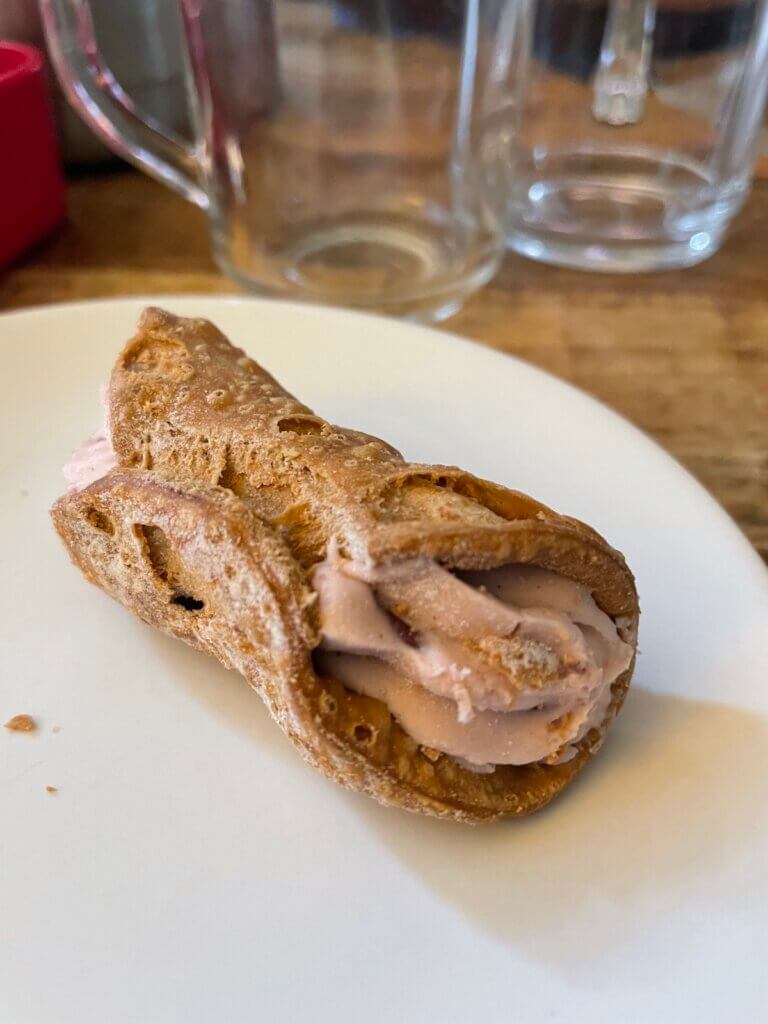Hoewel je het aan de kleur, geur en aan de smaak in combinatie met de plaatjes op de website wel af kunt leiden, is het vooraf niet precies duidelijk welke cannolo (het enkelvoud van cannoli) gevuld is met welke smaak vulling. Maar eigenlijk maakt dat ook niet zo veel uit, want eigenlijk is elke smaak is lekker, mits je van zoet houdt. Ze zijn maar klein, maar door de gefrituurde wafel met ricotta-vulling toch behoorlijk machtig. Aan eentje bij de koffie heb je al gauw genoeg (zeker wat calorieën betreft).