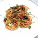 Pasta Puttanesca is een van de bekende klassieke Italiaanse pasta gerechten. Over het ontstaan van de naam Puttanesca gaan meerdere verhalen rond. Naar het schijnt noemt men Pasta Puttanesca zo, omdat 10-tallen jaren geleden in een restaurant in Italië op het punt stond om dicht te gaan en toen toch nog gasten kreeg. Eigenlijk waren er geen ingrediënten voor een 'normaal' gerecht op de kaart en toen is besloten om alle restjes te gebruiken en zo is Puttanesca onstaan. Andere verhalen over het ontstaan van dit recept zijn gerelateerd aan de vertaling van de 1e 5 letters van het woord 'puttanesca'. Op deze site gaan wij daar verder niet op in, maar vertaal dit woord maar eens en je weet genoeg! Een heel bijzondere doelgroep zullen wij maar zeggen...